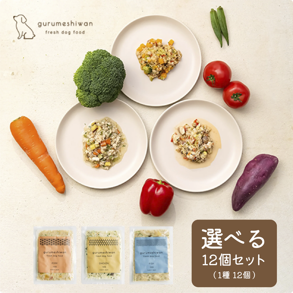 「ポーク」「チキン」「フィッシュ」から1種類選択する12個(6個+6個)セットです。グルメシワンは総合栄養食の基準を満たしたシニア犬・ミドルシニア犬の健康サポートにぴったりなフレッシュドッグフードです。「ポーク」「チキン」「フィッシュ」からお選びください。